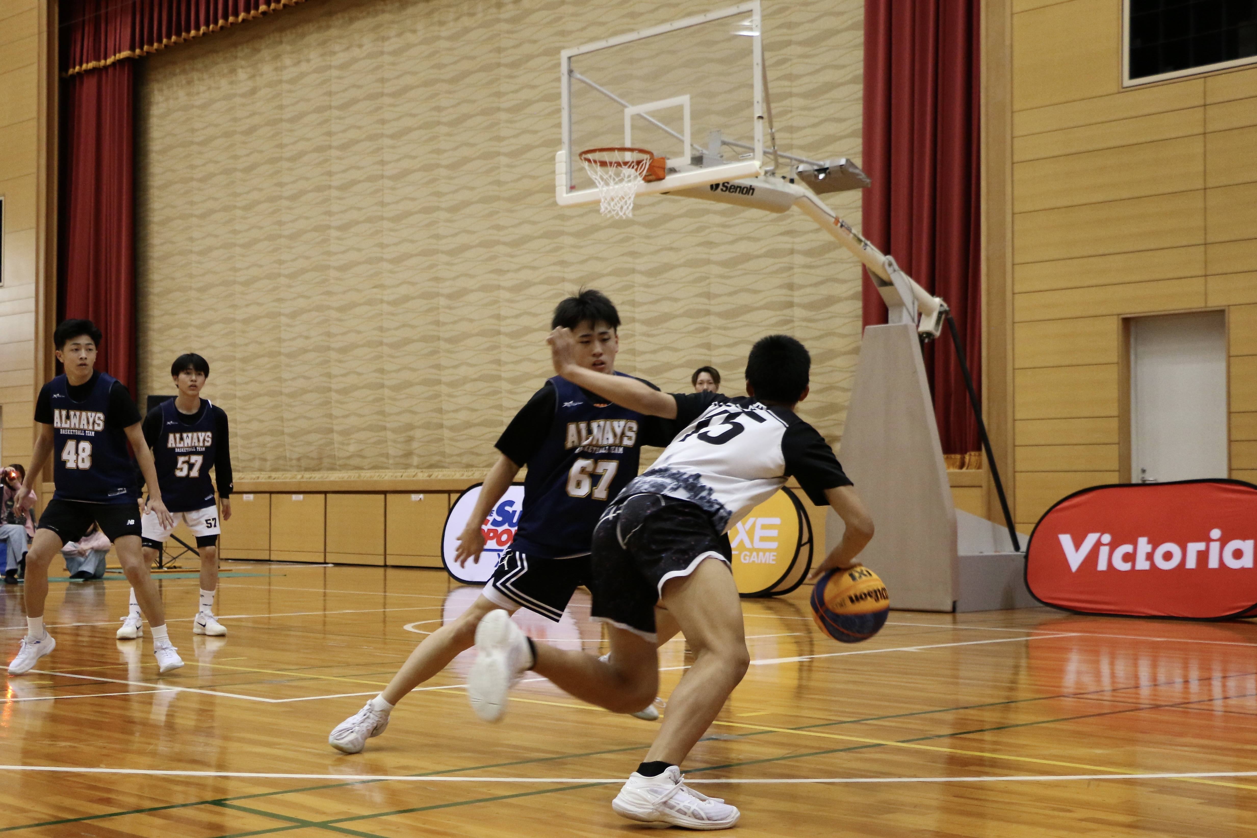 | 競技規則 | 原則、国際バスケットボール連盟のルール規定に準じますが、一部3x3.EXE GAME独自ルールを採用いたします。 ・ユニフォームは背番号が前後に表記された濃淡のユニフォームを各チームでご用意ください。 ユニフォームがお持ちでないチームにはビブスをお貸し出しいたします。 ・試合開始時点でチームがそろっていない場合は不戦敗となります。 ・試合球はWilson 3x3 Game Basketballを使用します。 ・試合はコイントス、またはジャンケンによって決定します。 ・1試合の試合時間は6~10分流し(大会ごとに異なります)、残り1分からはボールがデッドになったときはタイマーが止まります。 ・ショットクロックは12秒 ・ツーポイントライン(アーク)の内側からのシュートとフリースローは1点、アークの外側からのシュートは2点。 ・試合終了時点で得点が多いチーム、または21点先取したチームが勝ちとなります。 ・同点の場合、【1点先取 or フリースロー or じゃんけん】によって勝利チームを決定します。 ・チームファウルは6回まで罰則はなし。ただし7回目以降のファウルで相手チームにフリースローが与えられます。 ・アンスポーツマンライクファウル2回またはディスクォリファイリングファウル1回で当該試合を失格・退場となった場合、原則その日に残された次試合以降の試合も出場できません。 ・チャレンジ制度/ビデオチェックは原則採用いたしません。 |