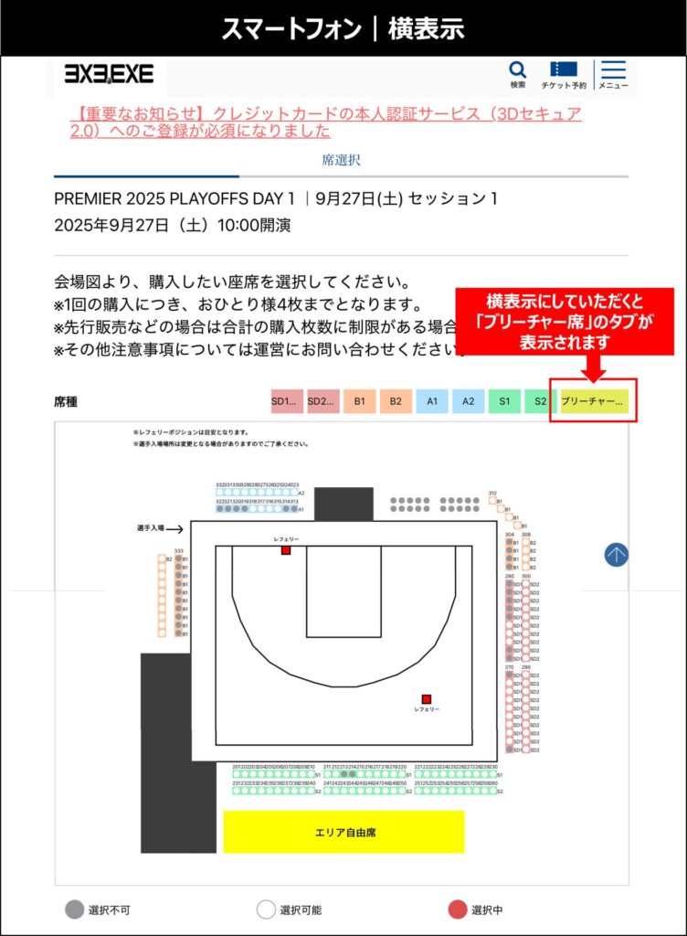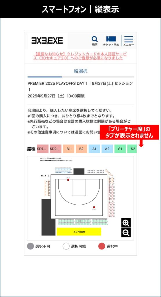 『ブリーチャー席(エリア自由)』につきまして、スマートフォンよりご購入いただく際、一部の機種におきまして『ブリーチャー席(エリア自由)』のタブが正しく表示されない事象が発生しております。