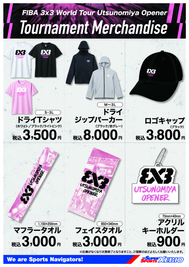 「FIBA 3x3 World Tour UTSUNOMIYA OPENER 2026」公式グッズの販売が決定いたしましたのでお知らせいたします。4月25~26日の会場内のブースで販売する他、ゼビオスポーツエクスプレス トナリエ宇都宮店 では先行販売を実施中です。是非グッズを購入して試合観戦を楽しんでください!